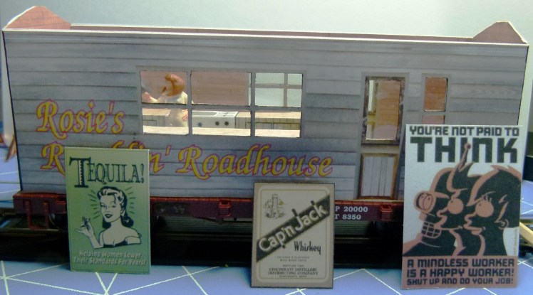 I spent most of the afternoon working on my cardstock model of Rosie’s Ramblin’ Roadhouse. Here’s a picture of the 2nd generation build.