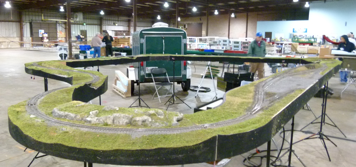 The MADmodules group pitched in to help setup Kevin Hunters Berrett Hill set of On30 modules.