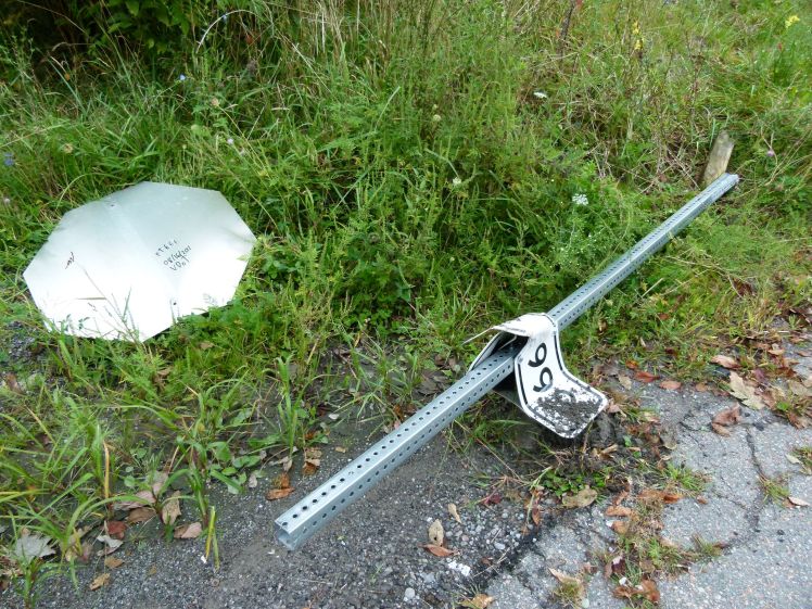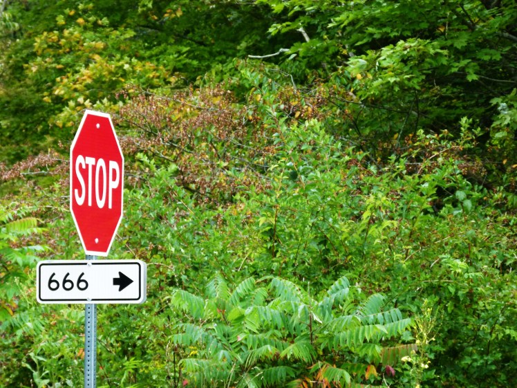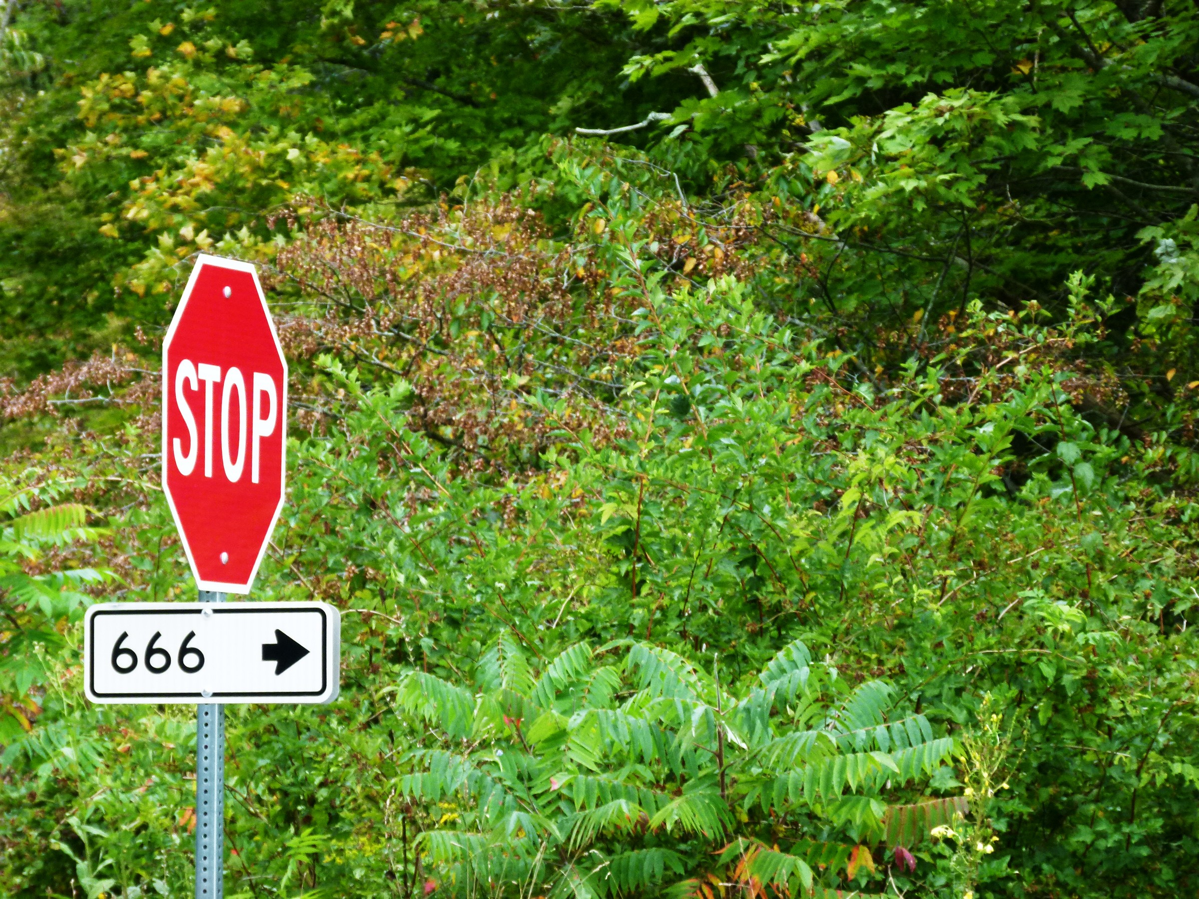 There were curved black tire scrub marks showing where a big rig had made the wrong turn and had to back up. In the process, they had driven clean over the stop sign and 666 road sign. I’m glad I had taken a photo only a few minutes before.