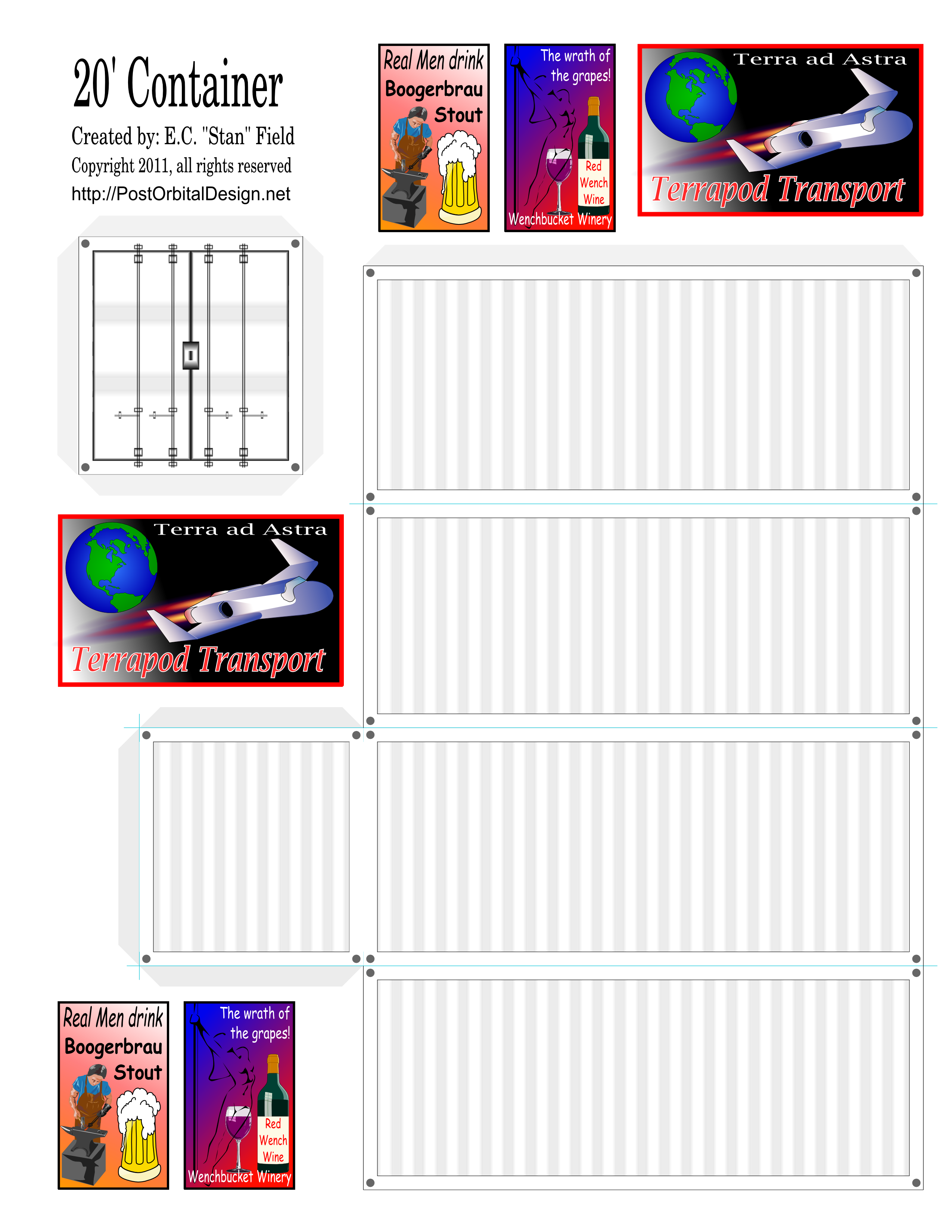 Here’s an O scale twenty-foot container. It has no printing on the sides so that you can print your own advertising markings to make it any real or fictitious brand you wish.